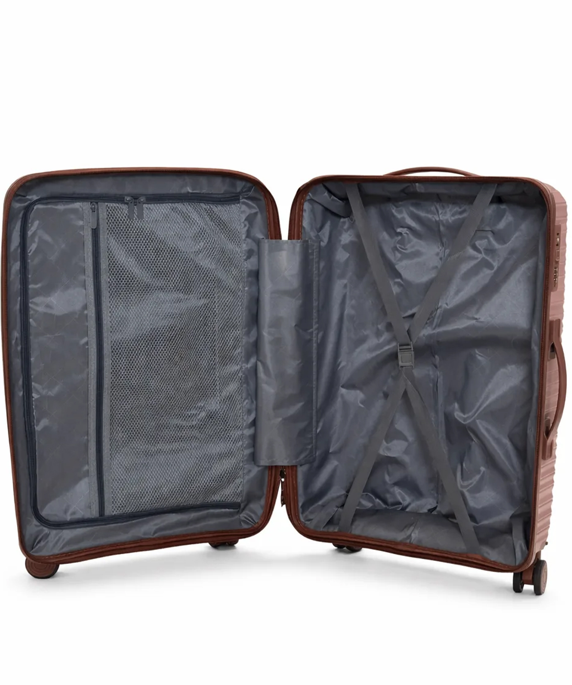 — Чемодан разделён на две части, в одной части есть ремни для фиксации багажа, вторая часть имеет тканевую переоородку которая закрывается на молнию и дополнительный карман в виде сетки, который закрывается на молнию.