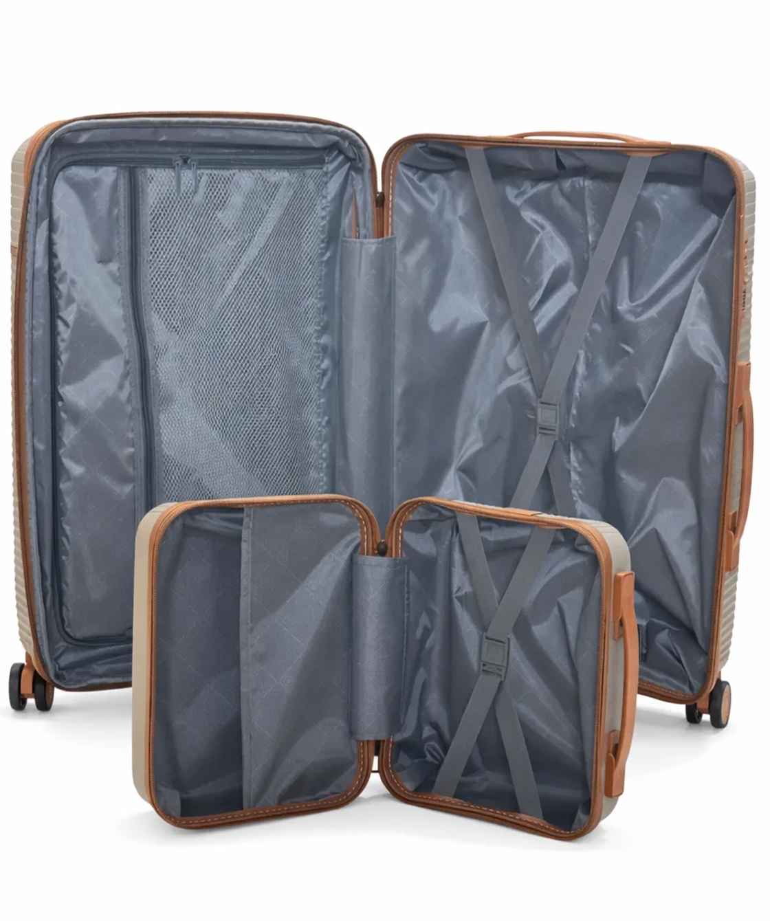 — Чемодан разделён на две части, в одной части есть ремни для фиксации багажа, вторая часть имеет тканевую переоородку которая закрывается на молнию и дополнительный карман в виде сетки, который закрывается на молнию.