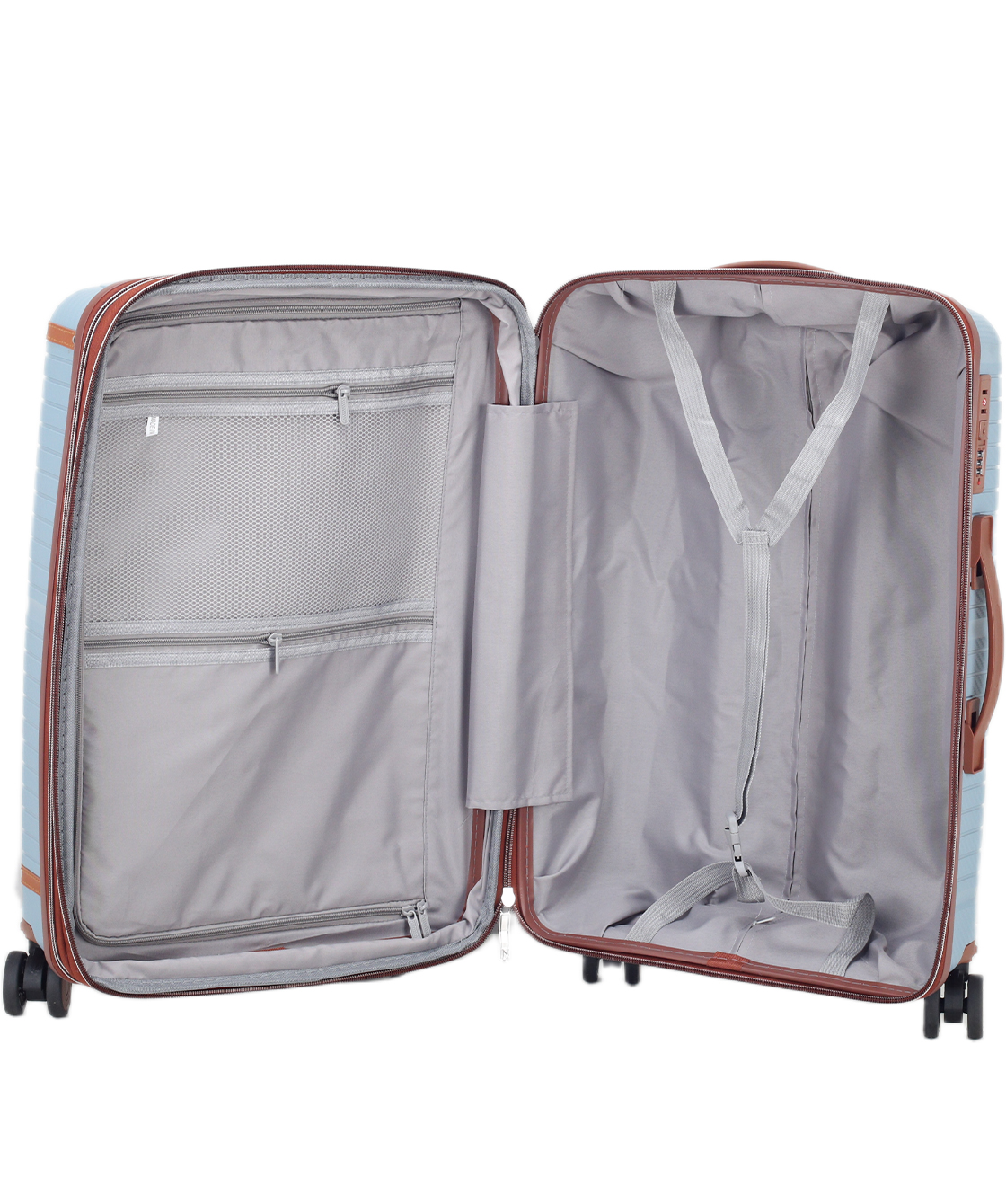 — Чемодан разделён на две части, в одной части есть ремни для фиксации багажа, вторая часть имеет тканевую переоородку которая закрывается на молнию и дополнительный карман в виде сетки, который закрывается на молнию.